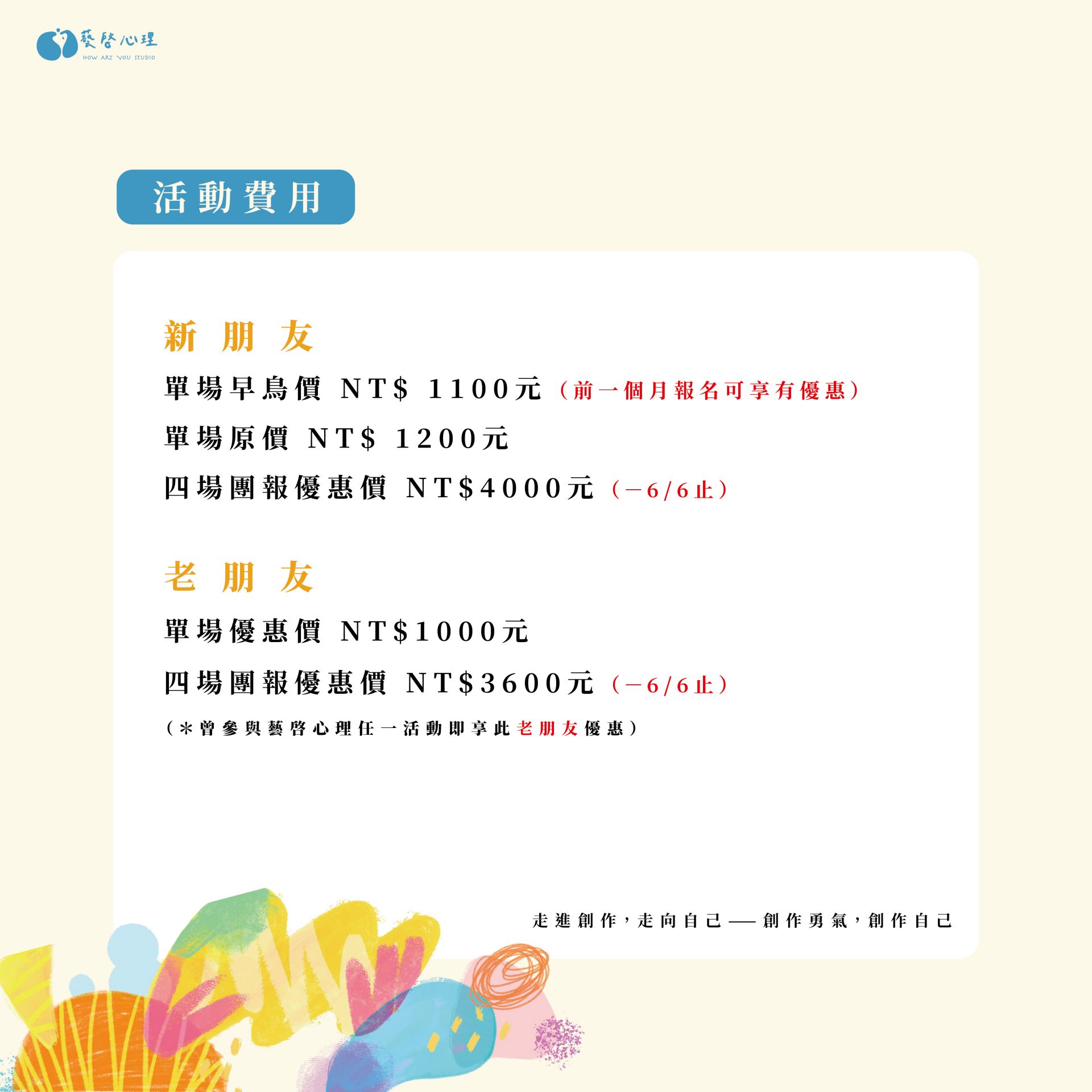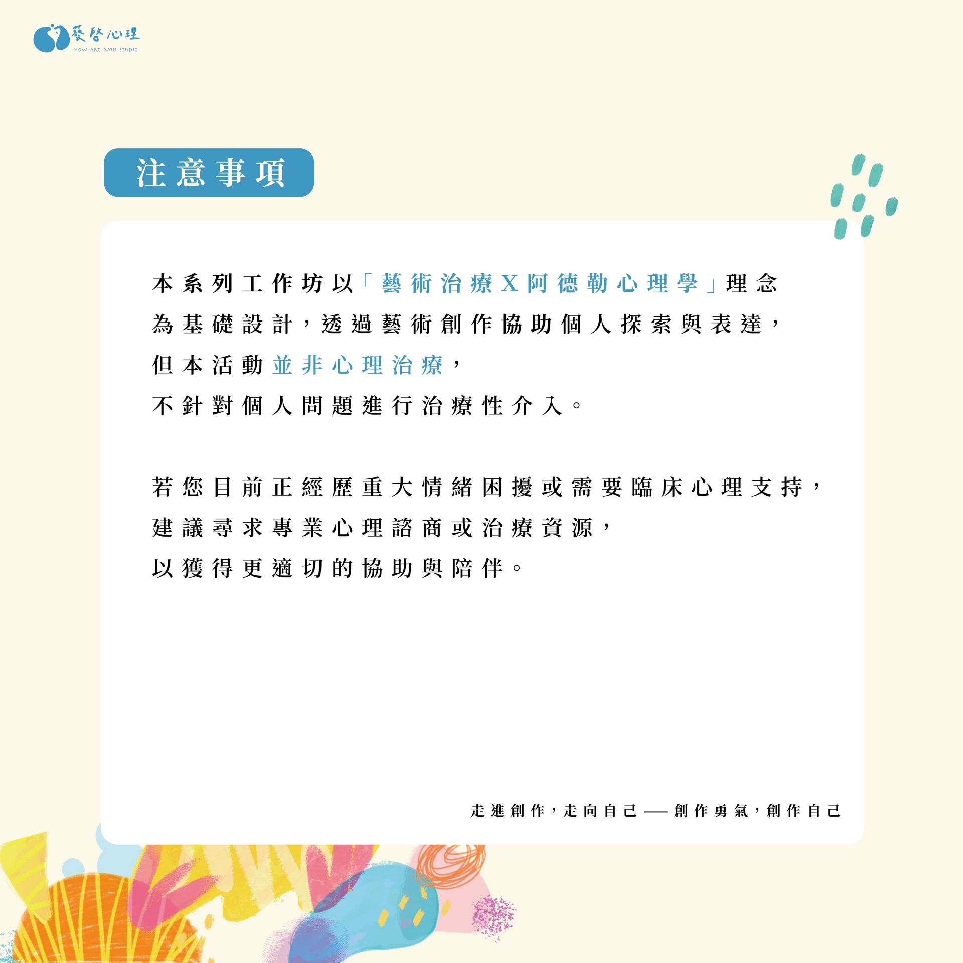 適合對象:對「自己」有興趣的朋友,沒有藝術治療背景也非常適合參加 !